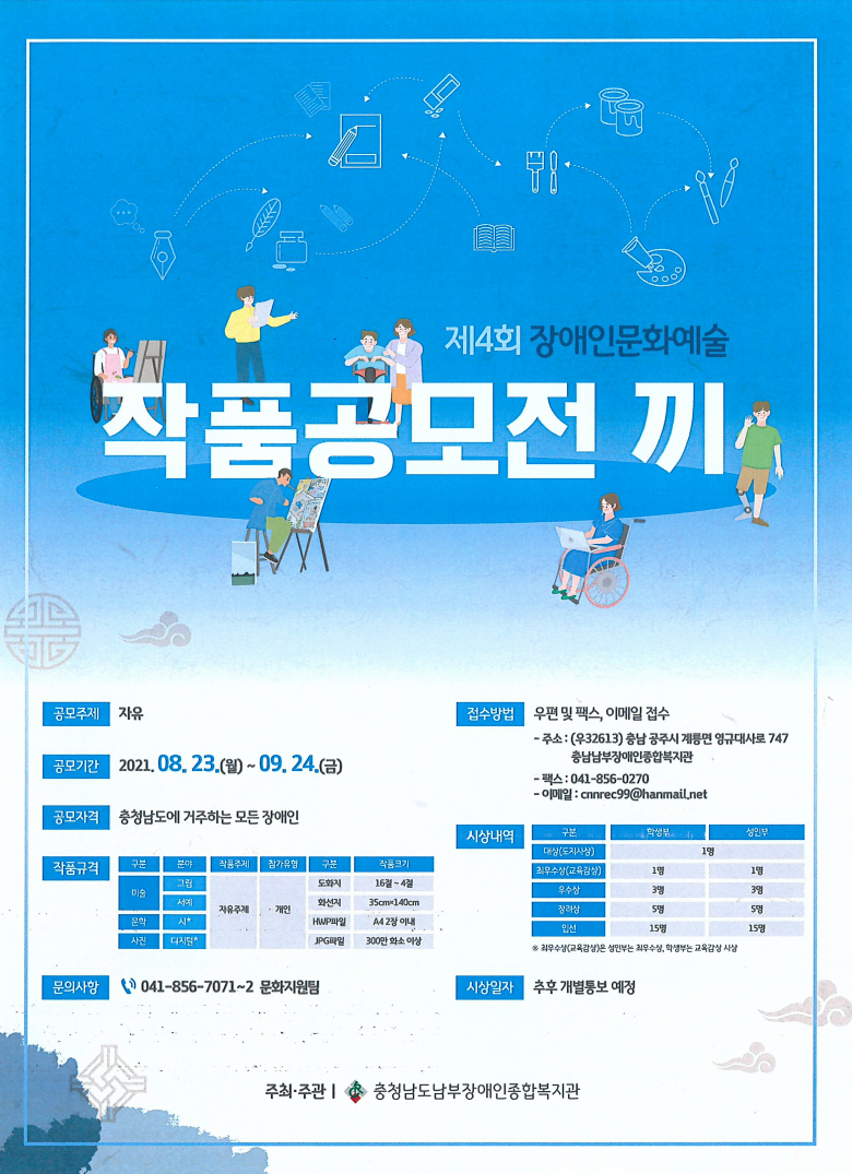 충남 도내 장애인들의 문화예술 활동 참여 활성화를 목적으로 2021년 장애인 문화예술 작품공모전 "끼"를 실시하오니 많은 관심과 참여 바랍니다.