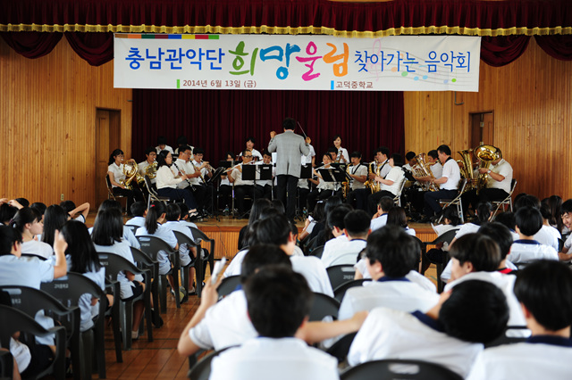2014년 6월 13일(금),예산군에 위치한고덕중학교로 충남관악단 희망울림 2014년도 두 번째 찾아가는 음악회를 다녀왔습니다. 고덕중학교 학생 뿐만 아니라 고덕초등학교 5,6학년 학생들도 함께 참석하였으며, 학생들의 뜨거운 호응을 받으며 즐거운 연주를 진행하고 왔습니다~