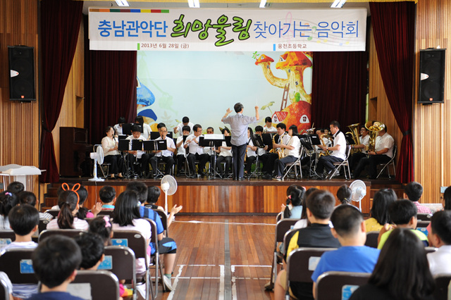 충남관악단 희망울림이 6월 28일에 2013년 찾아가는 음악회 네 번째 연주로 보령시에 위치한 웅천초등학교에서 가졌습니다. 동요와 연주곡 뿐만 아니라 악기소개까지 다양한 공연을 통해 희망울림과 웅천초등학교 학생과 교직원이 하나가 되는 시간이 되었으며 관악에 대한 이해와 장애인에 대한 인식을 개선하는 계기가 되었습니다.^^